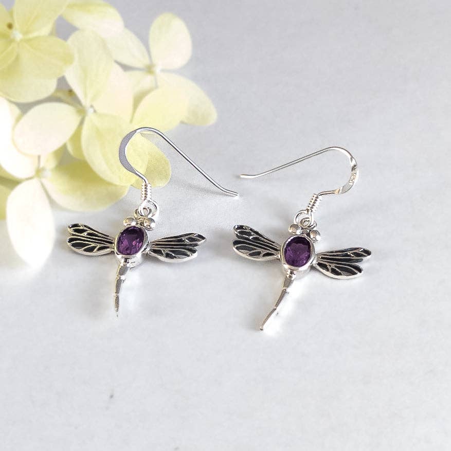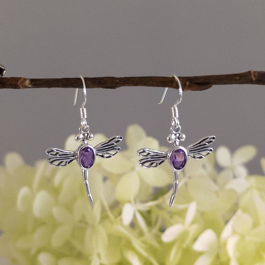 Dragonfly with Amethyst Earrings in Sterling Silver